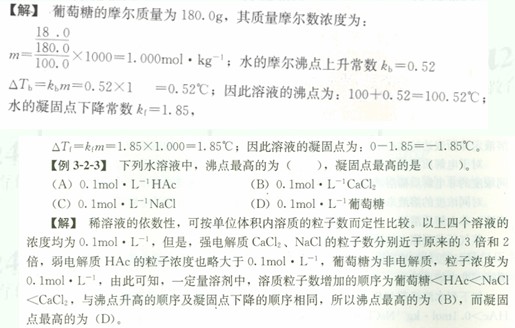 【例3-2-2】將18.0g葡萄糖C6 H12O6溶于100.0g水中,計算此溶液的凝固點和沸點。