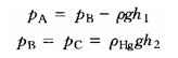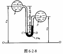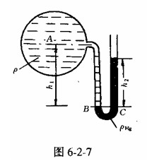 由于在工程上往往遇到的壓強較大,如果采用測壓管測壓,其管長必然很長,不宜安裝且讀數(shù)不方便。此時,可用U形測壓計。如圖6-2-7所示,因B,C是等壓面上的兩點,可得