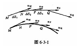 在流場中,從某一點M開始,繪出在指定時刻該點的流速矢量uM如圖6—3—1所示。在uM上取△Sl得空間另一點N,繪出N點在同一時刻的流速矢量uN,然后在uN上取△S2得P點,再繪出同一時刻P點的流速矢量uP,依此類推,可得在某一時刻t時折線MNPQ,若M,N,P,Q點無限接近,即△Sl、△S2、△S3……趨近于零時,則MNPQ是一條光滑曲線,此曲線稱流線。顯然,位于曲線MNPQ上的所有質(zhì)點在該指定時刻均沿此曲線流動。如果在整個流場中繪出同一時刻通過各空間點的一系列流線,則這些流線就形象地反映了該時刻的整個流動圖景。