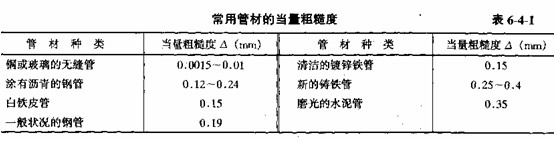 使用莫迪曲線求沿程阻力系數十分簡便,查圖的精度基本上能滿足工程上的需要。圖 中的Δ并非簡單的粗糙凸起高度,而是工業(yè)管道的當量粗糙度,常用管材的當量粗糙度見表6-4-1。
