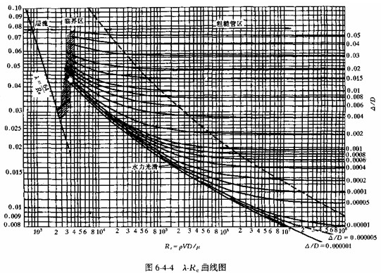 是根據大量工業(yè)管道的試驗資料提出的。為了簡化計算,莫迪在此公式基礎上繪成曲線(圖6-4-4)稱莫迪圖。從莫迪圖中可以看到:其中橫坐標和縱坐標都是按對數分格的,稱為雙對數格紙,這樣畫出來的λ-R,曲線圖形即為lgλ一lgRe的曲線圖形。