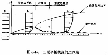圖6—4—6表示了二元平板繞流的邊界層。板上游為均勻來(lái)流,流速為U與平板平行??梢钥吹剑哼吔鐚雍穸?delta;是沿流發(fā)展的,在板端為零,隨后沿流逐漸增加。邊界層與主流實(shí)際上并沒(méi)有明顯分界,通常規(guī)定速度到達(dá)0.99U處為邊界層的外緣。在雷諾數(shù)較高時(shí),邊界層是很薄的,一般遠(yuǎn)小于被繞流物體的特征長(zhǎng)度。因此沿壁面法線方向速度梯度很大,必須考慮流體的黏性。但壓強(qiáng)沿壁面法線方向可以認(rèn)為是不變的。邊界層也有層流和紊流之分。如圖6-4-6所示,在乎板的前段是層流狀態(tài),隨著Rex的增加,層流邊界層將逐漸過(guò)渡到紊流狀態(tài)。對(duì)于光滑平板,臨界雷諾數(shù)Re=3×105~3X106。即使在紊流邊界層內(nèi),近壁處仍有一粘性底層。