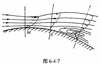 上述平板邊界層不出現(xiàn)邊界層與壁面脫離的分離現(xiàn)象。但當(dāng)黏性流體繞過彎曲壁面時,如圖6-4-7所示,在M點以后流速沿流減小,壓強沿流逐漸增加,出現(xiàn)逆壓梯度∂p/∂x>0。邊界層外的流體質(zhì)點,由于具有較大的動能,可以克服與流動方向相反的壓力差,繼續(xù)向前流動;而邊界層內(nèi)流動阻力影響較大,流體質(zhì)點具有的動能較小,而且愈靠近邊壁具有的動能愈小,以致流到某一點后因動能耗盡而停止。這一點稱邊界層的分離點S。在分離點S的下游,靠邊壁的水質(zhì)點在反向壓力差作用下,產(chǎn)生反向回流,于是在邊壁和主流之間形成旋渦區(qū)。這就是邊界層的分離現(xiàn)象。