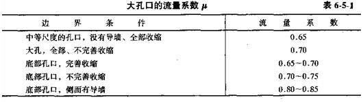 對(duì)于d/H>0.1的大孔口,也可近似應(yīng)用小孔口的公式,此時(shí)Ho為大孔口形心上的作用水頭。流量系數(shù)見表6-5—1。