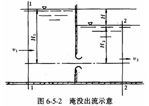 式(6-5-5)與式(6-5-4)形式完全一樣,流量系數(shù)μ值也相同,只有H0的涵義不同。當(dāng)容器相當(dāng)大時(shí),v0≈0和v1≈v2≈0。可以認(rèn)為H0=H,則自由出流時(shí)的作用水頭為液面至孔口中心的深度;淹沒(méi)出流時(shí)作用水頭為兩液面的高差。