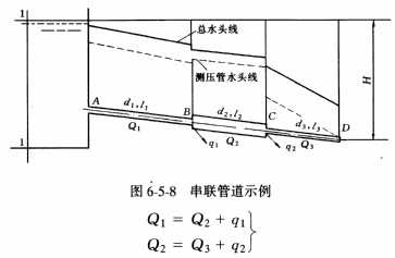 由不同直徑的管段順次聯(lián)接而成的管道稱為串聯(lián)管道。如中間無(wú)流量分出,則各管段流量相同。由于各管段直徑不同,流速不同,需分段計(jì)算水頭損失。整個(gè)管道的水頭損失等于各段損失之和。