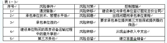 【背景資料】某工業(yè)建設(shè)工程項(xiàng)目建設(shè)單位委托了一家監(jiān)理單位協(xié)助組織工程招標(biāo)并負(fù)責(zé)施工監(jiān)理工作???a style='color:blue;' href='/leraning/class_jl/' target='_blank'>監(jiān)理工程師在主持編制監(jiān)理規(guī)劃時(shí),安排了一位專業(yè)監(jiān)理工程師負(fù)責(zé)該建設(shè)項(xiàng)目風(fēng)險(xiǎn)分析和相應(yīng)監(jiān)理規(guī)劃內(nèi)容的編寫(xiě)工作。經(jīng)過(guò)風(fēng)險(xiǎn)識(shí)別、評(píng)價(jià),按風(fēng)險(xiǎn)量的大小將該項(xiàng)目中的風(fēng)險(xiǎn)歸納為大、中、小三類。根據(jù)該建設(shè)項(xiàng)目的具體情況,監(jiān)理工程師對(duì)建設(shè)單位的風(fēng)險(xiǎn)事件提出了風(fēng)險(xiǎn)決策,相應(yīng)制定了風(fēng)險(xiǎn)控制措施(見(jiàn)表1―3)。