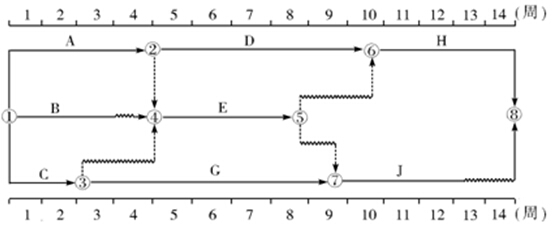 解析:圖中C的總時(shí)差為2周(J和G各有2周總時(shí)差),可令其晚開(kāi)工2周,最遲完成時(shí)間為第4周,與E最早開(kāi)始時(shí)間相同,E的最早完成時(shí)間第8周末與關(guān)鍵工作H開(kāi)始時(shí)間第10周末相差2周,施工機(jī)械閑置共計(jì)2周。