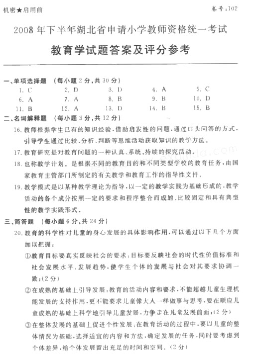湖北2008下半年教師證考試教育學(xué)答案(小學(xué))
