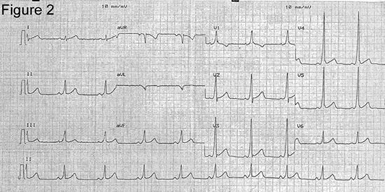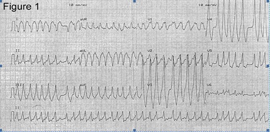 1.女,40歲,公交司機。因突發(fā)心悸半小時來診。訴既往有相類似發(fā)作,心悸、呼吸困難、頭暈,心跳快,持續(xù)數(shù)分鐘至數(shù)十分鐘不等,可自行停止。查體:170~300次/分,律不齊,Bp 85/40mmHg,神志清楚。無其他陽性體征。結(jié)合以下ECK,考慮診斷為:B
