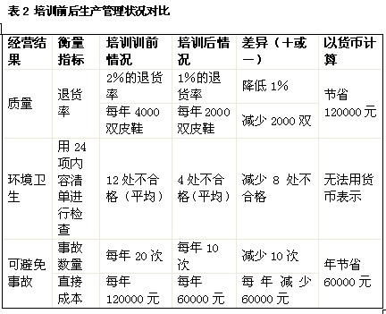 2.亞飛皮鞋廠在生產(chǎn)經(jīng)營中曾出現(xiàn)三個(gè)問題。第一,每年生產(chǎn)的皮鞋有2%由于質(zhì)量太差而被退貨;第二,車間生產(chǎn)作業(yè)環(huán)境不好,如車問地上的釘子可能會(huì)傷到員工;第三,可避免的事故發(fā)生率高于行業(yè)平均水平。為解決這些問題,廠部對(duì)管理人員進(jìn)行了如下培訓(xùn):(1)開展與質(zhì)量問題、員工不良習(xí)慣有關(guān)的績效管理和人際關(guān)系技能培訓(xùn);(2)如何表彰績效有提高的員工。一線主管人員、輪班監(jiān)督人員和經(jīng)理層共40人參加了由公司培訓(xùn)教師主講的為期2周的培訓(xùn)課程。培訓(xùn)在工廠附近的一家酒店內(nèi)進(jìn)行。培訓(xùn)項(xiàng)目是從一家咨詢機(jī)構(gòu)引進(jìn)的,其中包括了錄像資料和專用教材。而且.該項(xiàng)目的指導(dǎo)者是一名培訓(xùn)老師。有關(guān)資料如表1和表2所示。