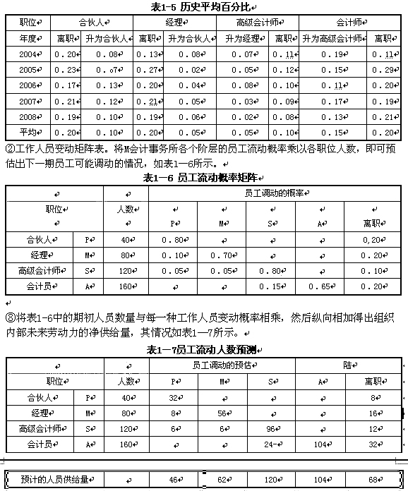 (1)問題分析 由于公司以前沒有做八力資源需求和供給預(yù)測(cè)的工作,致使公司人才青黃不接,其解決之道在于采取良好的預(yù)測(cè)技術(shù)。人力資源供給預(yù)測(cè)是以組織目標(biāo)為出發(fā)點(diǎn),根據(jù)各種環(huán)境的變化,主觀或運(yùn)用科學(xué)的方法,預(yù)測(cè)未來企業(yè)可以提供的人力資源,其預(yù)測(cè)方法種類繁多,大致可分為人力資源信息庫(kù)、管理人員接替模型、馬爾可夫模型三種。根據(jù)對(duì)資料的分析,可采用馬爾可夫模型這一方法預(yù)測(cè)該事務(wù)所的人力資源供給狀況。馬爾可夫模型是分析組織人員流動(dòng)的典型矩陣模型。它的基本思想是:通過發(fā)現(xiàn)組織人事變動(dòng)的規(guī)律,推測(cè)組織在未來的人員供給情況。馬爾可夫模型通常是分幾個(gè)時(shí)期來收集數(shù)據(jù),然后再得出平均值,利用這些數(shù)據(jù)代表每一種職位的人員變動(dòng)的頻率,就可以推測(cè)出人員的變動(dòng)情況。 (2)項(xiàng)目策劃 ①在表1―3中,有四種職位階層,分別為合伙人、經(jīng)理、高級(jí)會(huì)計(jì)師和會(huì)計(jì)員,其職位間調(diào)動(dòng)的比率分別記錄在表內(nèi)。根據(jù)過去的歷史資料,計(jì)算每一個(gè)職位從某時(shí)期到另一時(shí)期間兩個(gè)工作之間調(diào)動(dòng)的員工數(shù)量的歷史平均百分比,計(jì)算求出每個(gè)工作中人員變動(dòng)的概率,如表1―5所示。
