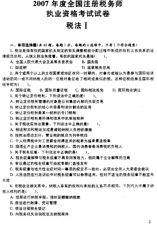 2007年注冊稅務(wù)師《稅法一》真題及答案