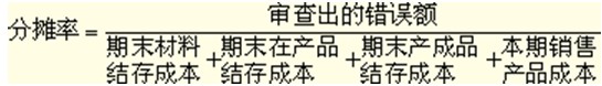 計(jì)算分?jǐn)偟姆椒ㄊ牵瑧?yīng)按產(chǎn)品成本核算過程逐步剔除擠占因素,即將審查出的需分配的錯(cuò)誤金額,按材料、自制半成品、在產(chǎn)品、產(chǎn)成品、產(chǎn)品銷售成本等核算環(huán)節(jié)的程序,一步一步地往下分配。將計(jì)算出的各環(huán)節(jié)應(yīng)分?jǐn)偟某杀緮?shù)額,分別調(diào)整有關(guān)賬戶,在期末結(jié)賬后,當(dāng)期銷售產(chǎn)品應(yīng)分?jǐn)偟腻e(cuò)誤數(shù)額應(yīng)直接調(diào)整利潤數(shù)。在實(shí)際工作中一般較多地采用“按比例分?jǐn)偡ā?。分?jǐn)偮实挠?jì)算公式如下: