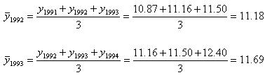 例12 下表是1991-2000年我國的原煤產(chǎn)量數(shù)據(jù),計算移動項數(shù)k=3,k=4時的反映趨勢變動的新數(shù)列。