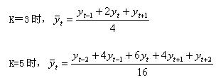 注意:當(dāng)k取奇數(shù)或偶數(shù)的不同形式時,處理方法有區(qū)別。對于k取奇數(shù)時,可直接運(yùn)用公式(3?12)即可;當(dāng)k取偶數(shù)時,要在第一次對原數(shù)列作移動平均后,對所得新數(shù)列再做一次相鄰兩項的移動平均,這樣才能完成中心化。