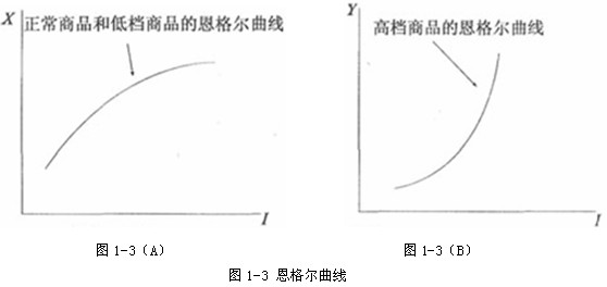 圖1-3(A)表明,消費(fèi)者對(duì)正常商品和低檔商品的需求量的增加幅度需小于他們的收入增加的幅度,既每增加一個(gè)單位的可支配收入,消費(fèi)者對(duì)正常商品和低檔商品消費(fèi)的增加量是遞減的。圖1-3(B)表明,消費(fèi)者對(duì)高檔商品需求量增加的幅度需大于他們收入增加的幅度,即每增加一個(gè)單位的可支配收入,消費(fèi)者對(duì)高檔商品消費(fèi)的增加量是遞增的。