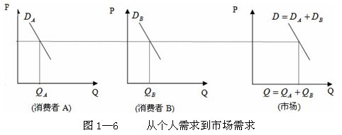 需求有個(gè)人需求與市場(chǎng)需求之分。個(gè)人需求也稱個(gè)別需求,是指在一定時(shí)期和每一種給定的價(jià)格水平上消費(fèi)者個(gè)人愿意并且能夠購買的某種商品的數(shù)量;市場(chǎng)需求是指在一定時(shí)期和每一種給定的價(jià)格水平上所有消費(fèi)者愿意并且能夠購買的某種商品的數(shù)量。據(jù)此可以推知,某種商品的市場(chǎng)需求量一定是每一價(jià)格水平上所有個(gè)人需求量之和;而某種商品的市場(chǎng)需求必定是所有消費(fèi)者個(gè)人對(duì)該種商品的需求之和,因此市場(chǎng)需求曲線也一定是所有個(gè)人需求曲線的水平加總。