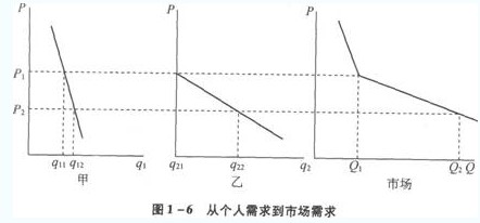 從圖形來(lái)看,個(gè)人需求曲線反映單個(gè)消費(fèi)者愿意且能夠購(gòu)買(mǎi)某種產(chǎn)品的數(shù)量與其價(jià)格之間的關(guān)系;而市場(chǎng)需求曲線則反映市場(chǎng)上全體消費(fèi)者愿意且能夠購(gòu)買(mǎi)某種產(chǎn)品的數(shù)量與其價(jià)格之間的關(guān)系。市場(chǎng)需求曲線可由個(gè)人需求曲線橫向相加求得,如圖1―6所示。在圖1―6中,假定市場(chǎng)上只有兩個(gè)消費(fèi)者甲和乙對(duì)某種商品存在需求。價(jià)格水平為P1時(shí),他們的個(gè)人需求分別為q11和q21,因此此時(shí)市場(chǎng)需求為Q1=q11+q21。同理,價(jià)格水平為P2時(shí),他們的個(gè)人需求分別為q12和q22因此此時(shí)市場(chǎng)需求為Q2=q12+q22。依此類推,可以得到整條市場(chǎng)需求曲線。由于市場(chǎng)需求是所有個(gè)人需求的加總,因此,市場(chǎng)需求曲線也向右下方傾斜,其斜率為負(fù)。