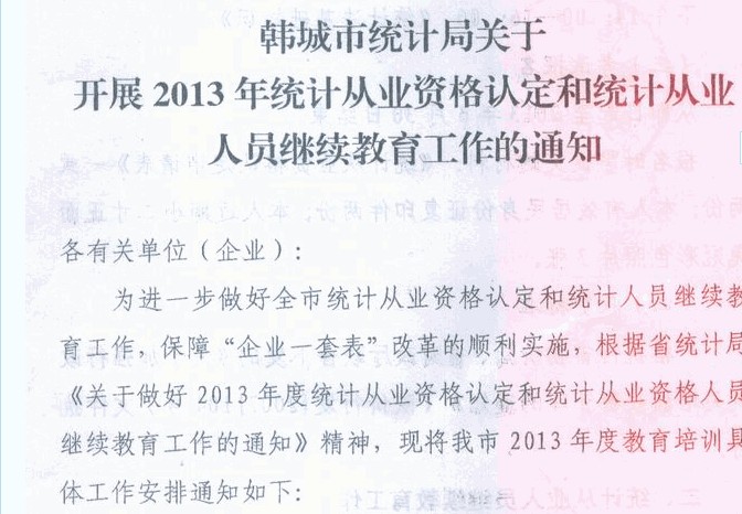2013年韓城統(tǒng)計從業(yè)資格認定和繼續(xù)教育