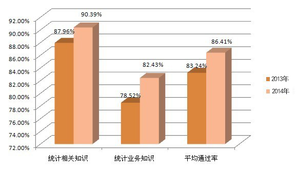 環(huán)球網(wǎng)校(www.edu24ol.com)通過對網(wǎng)校學(xué)員的回訪及學(xué)員的成績反饋,總結(jié)出網(wǎng)校2014年統(tǒng)計師考試輔導(dǎo)各科通過率分別為:統(tǒng)計相關(guān)知識通過率為90.39%。統(tǒng)計業(yè)務(wù)知識通過率為82.43%,平均通過率為86.41%。