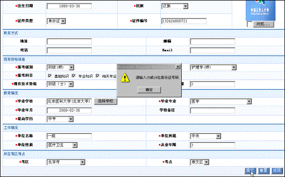 (6) 信息錄入后提交時,系統(tǒng)會自動對錄入信息的規(guī)范性和邏輯關(guān)系進行檢查,如果存在錯誤或不合理的地方,系統(tǒng)自動給出相應(yīng)提示。如身份證號必須為18位或15位,身份證號與出生年月不符,現(xiàn)有資格年限必須大于從業(yè)年限等。如圖(3-4)
