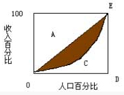 如圖,OCE線即為洛侖茨曲線,它越靠近直線OAE,所表示的不平等程度越低;越靠近折線ODE,所表示的不平等程度越高。