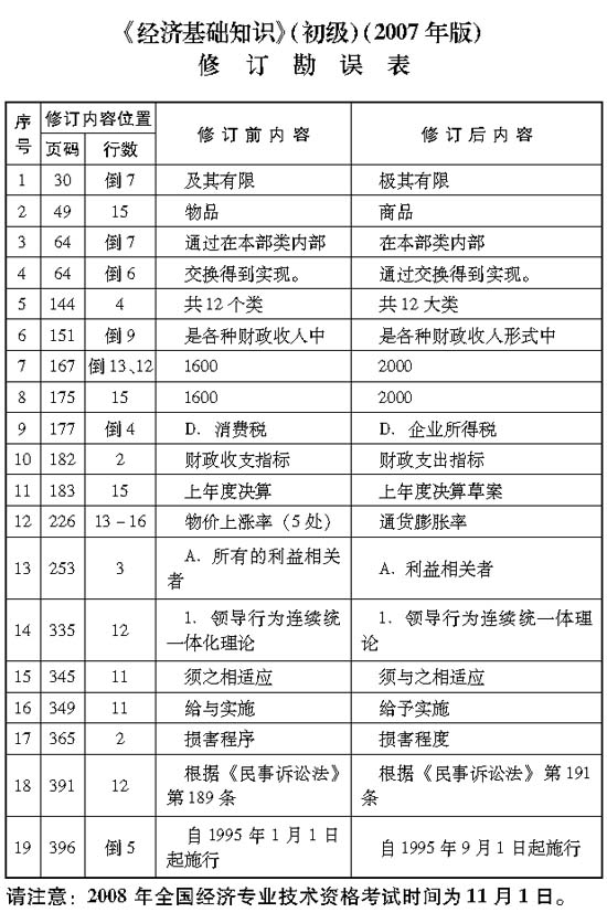 2008 年度全國經(jīng)濟(jì)專業(yè)技術(shù)資格考試時(shí)間定于11 月1 日。人事部人事考試中心根據(jù)社會(huì)經(jīng)濟(jì)發(fā)展和相關(guān)法規(guī)出臺(tái)的實(shí)際情況,針對2007 年版考試用書編校和印制中出現(xiàn)的問題,2008 年經(jīng)濟(jì)考試用書做部分調(diào)整。其中,工商管理等9 個(gè)專業(yè)和經(jīng)濟(jì)基礎(chǔ)知識共20 種考試用書采取勘誤的方式進(jìn)行修訂(點(diǎn)擊查看人事考試中心通知原文件)。以下為中國人事出版社《經(jīng)濟(jì)基礎(chǔ)知識(初級)》(2007年版)教材勘誤內(nèi)容: