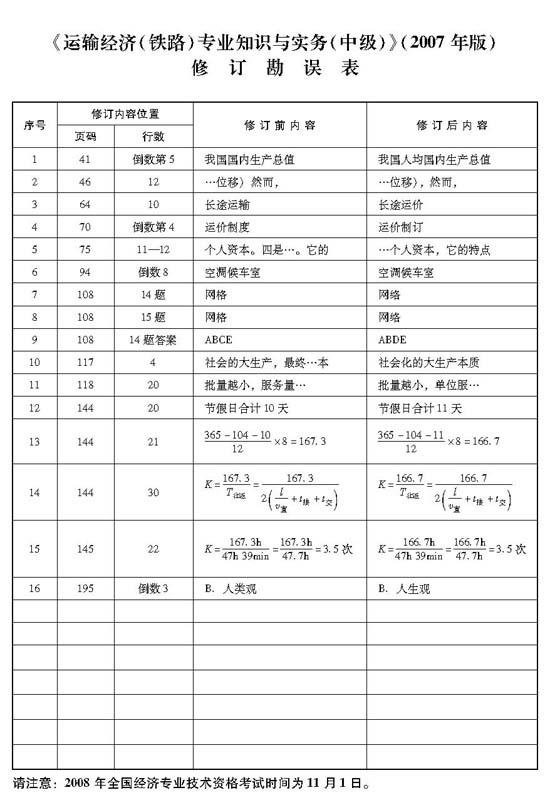 2008 年度全國經(jīng)濟(jì)專業(yè)技術(shù)資格考試時(shí)間定于11 月1 日。人事部人事考試中心根據(jù)社會(huì)經(jīng)濟(jì)發(fā)展和相關(guān)法規(guī)出臺(tái)的實(shí)際情況,針對(duì)2007 年版考試用書編校和印制中出現(xiàn)的問題,2008 年經(jīng)濟(jì)考試用書做部分調(diào)整。其中,工商管理等9 個(gè)專業(yè)和經(jīng)濟(jì)基礎(chǔ)知識(shí)共20 種考試用書采取勘誤的方式進(jìn)行修訂(點(diǎn)擊查看人事考試中心通知原文件)。以下為中國人事出版社《運(yùn)輸經(jīng)濟(jì)(鐵路)專業(yè)知識(shí)與實(shí)務(wù)(中級(jí))》(2007年版)教材勘誤內(nèi)容: