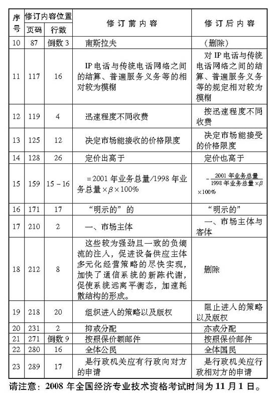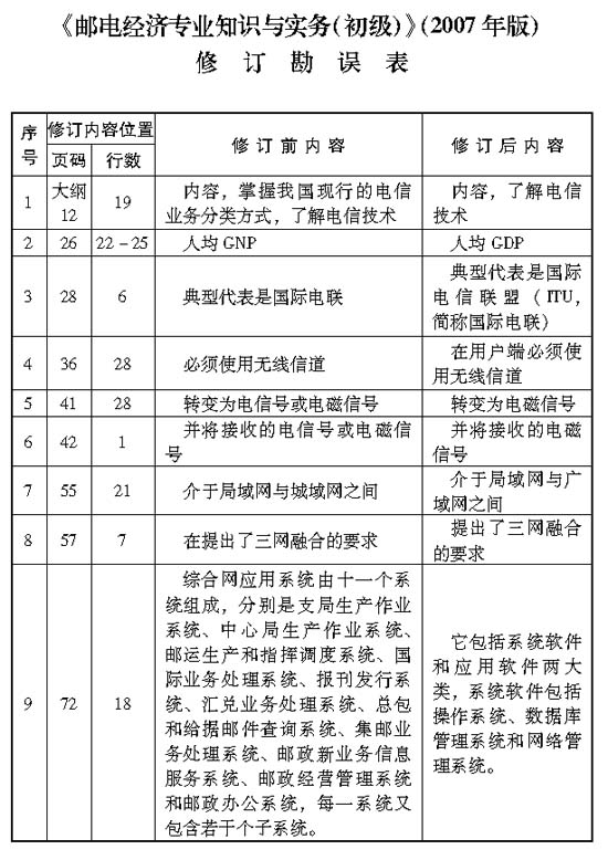 2008 年度全國經(jīng)濟(jì)專業(yè)技術(shù)資格考試時間定于11 月1 日。人事部人事考試中心根據(jù)社會經(jīng)濟(jì)發(fā)展和相關(guān)法規(guī)出臺的實(shí)際情況,針對2007 年版考試用書編校和印制中出現(xiàn)的問題,2008 年經(jīng)濟(jì)考試用書做部分調(diào)整。其中,工商管理等9 個專業(yè)和經(jīng)濟(jì)基礎(chǔ)知識共20 種考試用書采取勘誤的方式進(jìn)行修訂(點(diǎn)擊查看人事考試中心通知原文件)。以下為中國人事出版社《郵電經(jīng)濟(jì)專業(yè)知識與實(shí)務(wù)(初級)》(2007年版)教材勘誤內(nèi)容: