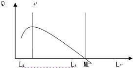(2)L1后邊際產(chǎn)量遞減,繼續(xù)增加勞動投入到L3,MP=0. 如果再增加勞動投入,邊際產(chǎn)量為負(fù)值。(勞動相對過剩,資本不足,勞動的邊際產(chǎn)量下降。達(dá)到L3,增加單位勞動帶來的邊際產(chǎn)品為0,勞動量繼續(xù)增加就必然出現(xiàn)人浮于事的狀態(tài),勞動邊際產(chǎn)品為負(fù)值,即增加勞動不僅不能增加產(chǎn)出,反而會導(dǎo)致總產(chǎn)量下降。)