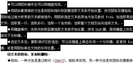◆用鼠標(biāo)最簡單的方法是將鼠標(biāo)指針移到要選取文本的開始位置,按住鼠標(biāo)左鍵拖動(dòng),鼠標(biāo)拖過地方所有的文本都被選中。用鼠標(biāo)選定文本的其他方法見教材P168;如選取某些文字,選取某一行,選取多行,選取一個(gè)自然段,選取整個(gè)文檔及縱向選擇文本。