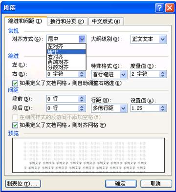 或者單擊“格式”菜單中的“段落”命令,在彈出的“段落”對話框中的“對齊方式”中設(shè)置。