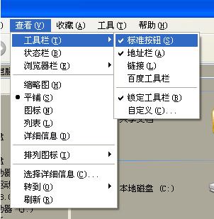 (3)工具欄。若當(dāng)前的資源管理器窗口沒有顯示所需要的工具欄命令按鈕,看單擊“查看”“工具欄”“標(biāo)準(zhǔn)按鈕”命令。