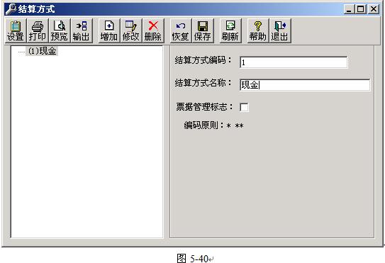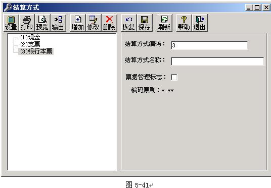 結(jié)算方式設(shè)置主要包括:結(jié)算方式編碼、結(jié)算方式名稱、票據(jù)管理標(biāo)志等。票據(jù)管理標(biāo)志是軟件為輔助出納對(duì)銀行結(jié)算票據(jù)而設(shè)置的功能,類似與手工系統(tǒng)中的支票登記簿的管理方式。