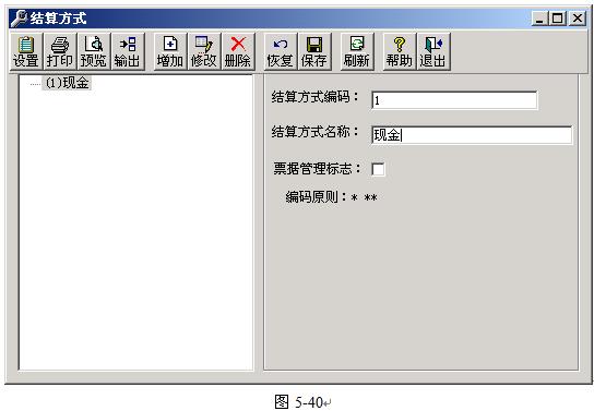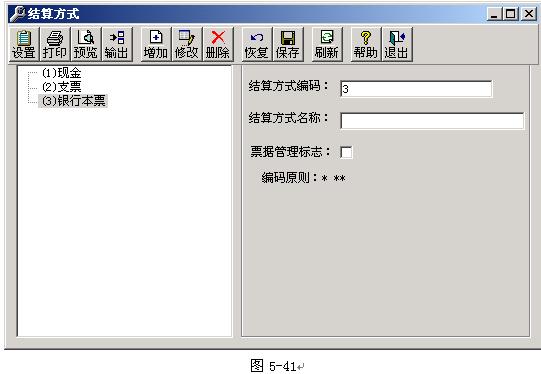 結(jié)算方式設(shè)置主要包括:結(jié)算方式編碼、結(jié)算方式名稱、票據(jù)管理標(biāo)志等。票據(jù)管理標(biāo)志是軟件為輔助出納對(duì)銀行結(jié)算票據(jù)而設(shè)置的功能,類似與手工系統(tǒng)中的支票登記簿的管理方式。