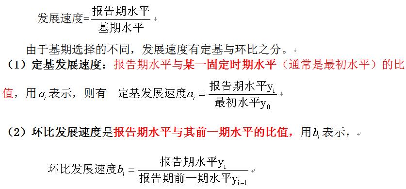 1、發(fā)展速度:是以相對數(shù)形式表示的兩個不同時期發(fā)展水平的比值,表明報告期水平已發(fā)展到基期水平的幾分之幾或若干倍。