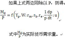 弗里德曼是沿著劍橋方程式來表達(dá)他的貨幣需求思想的。同時(shí),吸收了凱恩斯主義關(guān)于收入和利率決定貨幣需求量的思想。他認(rèn)為,在劍橋方程式Md=KPY中,P,Y是影響貨幣需求許多變量中的兩個(gè)變量, 代表其它變量,實(shí)際上是貨幣流通速度的倒數(shù)(1/v)