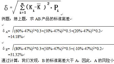 標(biāo)準(zhǔn)差反映的是概率分布中各種可能結(jié)果對(duì)期望值的偏離程度。標(biāo)準(zhǔn)離差越小,說(shuō)明離散程度小,風(fēng)險(xiǎn)也就越小。