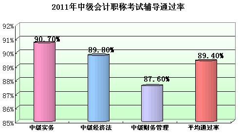 中級會計實務90.7%、中級經(jīng)濟法89.8%、中級財務管理87.6%、平均通過率89.4%