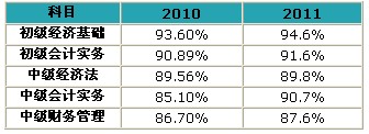 初級會計實務91.6%、初級經(jīng)濟法基礎94.6%、平均通過率93.2%
