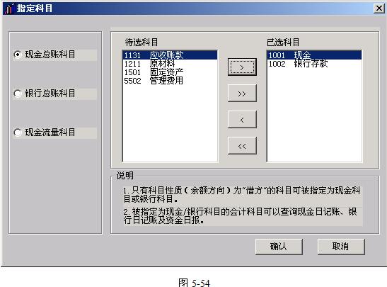 指定會計科目是指定出納專管的科目。指定科目后,才能執(zhí)行出納簽字,從而實現(xiàn)現(xiàn)金、銀行賬管理的保密性,也才能查看現(xiàn)金或銀行存款日記賬。