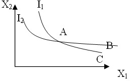 A、B均位于I2,AB偏好相同;BC均位于 I1,BC偏好形同,根據(jù)偏好的可傳遞性,B與C的偏好相同,但這是不可能的,因為B比C具有更多的X2,根據(jù)多多益善假定,B必定比C更受偏好。因此無差異曲線不能相交。