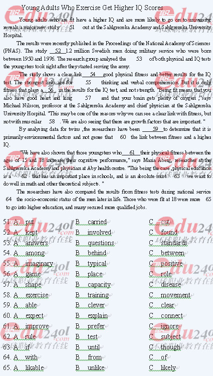 完型填空: Young Adults Who Exercise Get Higher IQ Scores