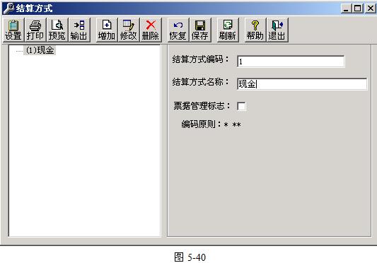結(jié)算方式設(shè)置主要包括:結(jié)算方式編碼、結(jié)算方式名稱、票據(jù)管理標(biāo)志等。票據(jù)管理標(biāo)志是軟件為輔助出納對(duì)銀行結(jié)算票據(jù)而設(shè)置的功能,類似與手工系統(tǒng)中的支票登記簿的管理方式。