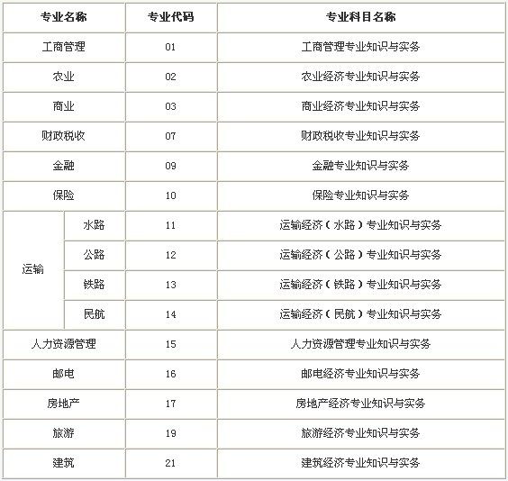 《專業(yè)知識和實務(wù)》科目均分為工商管理、農(nóng)業(yè)、商業(yè)、財政稅收、金融、保險、運輸(水路、公路、鐵路、民航)、人力資源管理、郵電、房地產(chǎn)、旅游、建筑12個專業(yè),其中運輸分為水路、公路、鐵路、民航4個子專業(yè)。