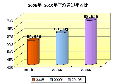 環(huán)球網(wǎng)校2008年-2010年平均通過率為:2008年55.62%,2009年60.39%,2010年68.53%。