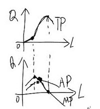 根據(jù)MP曲線的圖形可以給出TP曲線??偖a(chǎn)量曲線先以遞增的速度上升(此時MP遞增),后以遞減的速度上升(此時MP下降,但MP>0),總產(chǎn)量達到最大值后下降。