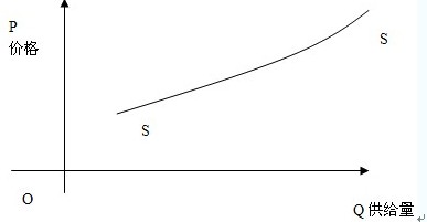 供給曲線:用橫軸表示供給量,縱軸表示價格,我們把供給和價格之間的關系用曲線表示出來,這條曲線被稱為供給曲線。如下圖: