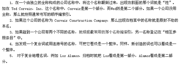 6.在編制那些含有方位詞做重要成分的名稱索引時,例如,Northw。sternLife Insurance Company,在歸檔時每個方位詞都要分開,即 North作為第一部分,Western作為第二部分。